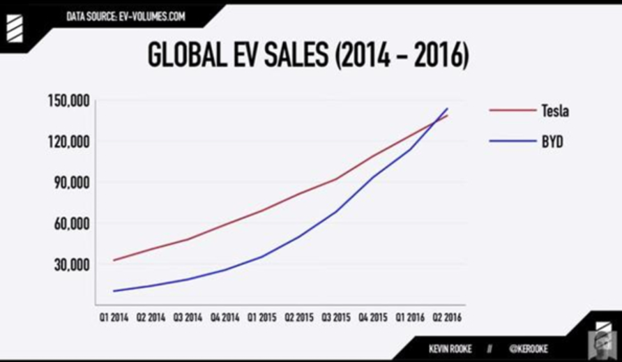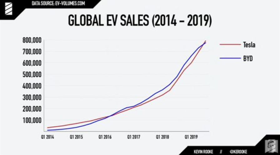 根據(jù)Kevin Rooke的統(tǒng)計(jì),與比亞迪同樣成立于2003年的特斯拉,在2016年前,銷(xiāo)量一直都在比亞迪之上,直到2016年1月左右,比亞迪整體銷(xiāo)量才超過(guò)了特斯拉,并在長(zhǎng)達(dá)三年的時(shí)間里始終保持全球新能源汽車(chē)銷(xiāo)量第一。但隨著 Model 3 產(chǎn)能的釋放,截至今年10月,特斯拉再次實(shí)現(xiàn)了反超。