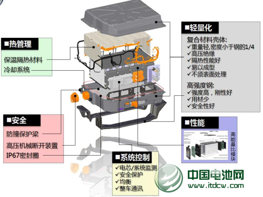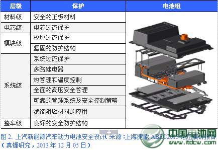 上汽稱其在車用動力電池的安全性上有完善的設計來保障,亦即在材料、電芯、模塊、系統和整車5個層級上多重保護,層層設防,以確保電池的安全使用,見圖2。在做到5層保護的基礎上,電池組的位置布局也很重要。上汽的車用動力電池組布置優先考慮整車中部,利用車結構梁框架提供保護,避免碰撞潰縮區域,這樣同時可以減少動力電池重量對整車操控性的影響。如果動力電池無法布置于整車中部區域,便要改進整車和動力電池設計方案以確保安全。