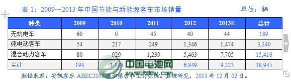 上牌數據顯示,從2009年至今,中國節能與新能源客車市場發展很快。2009年時,包括無軌電車、純電動客車和混合動力客車在內,中國市場共銷售194輛,到2012年高達6,849輛,增長了3,430.41%。2013年初預計2013年市場總銷量將達到9,223輛,比上年增長34.66%。現在看來,2013年的市場發展實際情況比當初預計的還要好。具體相關數據見表1。
