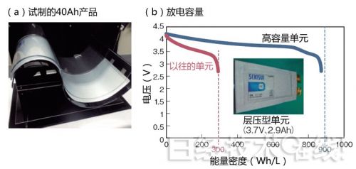 積水化學(xué)打算涉足的鋰離子充電電池是容量約為目前3倍的層壓型單元(圖1)注1)。該公司在新聞發(fā)布會上展示了容量約為40Ah的大型層壓型單元。能量密度方面,以電壓為3.7V,容量為2.9Ah的層壓型單元為例,單位體積的能量密度達(dá)到900Wh/L,單位重量達(dá)到340Wh/kg。
