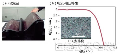 染料敏化太陽能電池方面,無需高溫?zé)Y(jié),只在室溫下就能制造薄膜型色素增感電池(圖2)。色素增感電池是在TiO2等氧化物半導(dǎo)體層吸附色素,作為光電轉(zhuǎn)換層利用的有機太陽能電池之一。此次利用產(chǎn)業(yè)技術(shù)綜合研究所開發(fā)的陶瓷成膜技術(shù)“氣溶膠沉積(AD)法*”,在室溫下形成了TiO2多孔膜,確認(rèn)了作為色素增感電池的發(fā)電性能注3)。