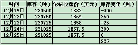 12月19日至12月25日倫鉛總體走勢趨緩,總體在1850左右小幅震蕩,昨晚因圣誕節(jié),外盤休市,庫存返利變動幅度也不大,本周累計增加225噸。