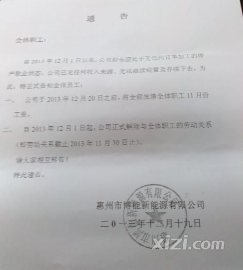 中國電池雜志-中國電池網12月30日訊(趙卓然 北京報道)今早接到網友爆料,12月19日惠州博能新能源有限公司向全體員工發布通告稱,公司自12月1日以來,已經處于無任何訂單加工的停產歇業狀態,公司已無任何收入來源,無法經營及存續下去,告知全體員工:12月20日之前將全額發放11月工資;自12月1日起,公司正式解除與全體員工的勞動關系,請大家互相轉告。