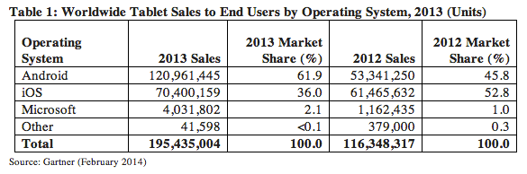 北京時(shí)間3月3日消息,據(jù)科技博客Techcrunch報(bào)道,市場(chǎng)研究機(jī)構(gòu)Gartner今天發(fā)布的一份最新報(bào)告顯示,2013年全球平板電腦銷(xiāo)量達(dá)到1.95億部,其中安卓系統(tǒng)產(chǎn)品銷(xiāo)量為1.21億部、占比62%;蘋(píng)果iPad銷(xiāo)量為7000萬(wàn)部、占比36%。