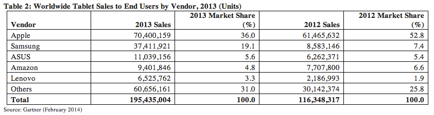 Gartner報(bào)告顯示,廠商方面,蘋(píng)果依舊一枝獨(dú)秀:去年iPad銷(xiāo)量達(dá)到7000萬(wàn)部,份額為36%;三星憑借Galaxy系列,在平板電腦市場(chǎng)份額突飛猛進(jìn):去年三星平板銷(xiāo)量為3700萬(wàn)部、占比19%。而在2012年時(shí),蘋(píng)果在平板電腦市場(chǎng)份額高達(dá)53%,而三星份額僅為7%。華碩平板去年銷(xiāo)量為1100萬(wàn)部,市場(chǎng)份額為5.6%,列第三。