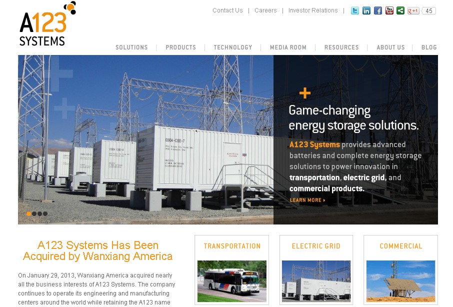 但對于美國A123公司來說不是個好消息,國內媒體今天紛紛轉載了“美國電池制造商A123已宣布將更名為B456”的消息,實在令人啼笑皆非。本網記者致電美國A123上海辦事處相關人員核實,“純屬惡搞,怎么會呢?A123 Systems Inc.改名B456是真的,但是和萬向買的A123 Systems LCC已沒關系了。A123 Systems Inc. 已改成A123 Systems LLC,原來的公司已經死了。”該人士稱,“目前A123被萬向集團收購后,的確在進行大幅度的人員調整,上海辦事處已經取消,原上海留守人員將搬到杭州上班”。