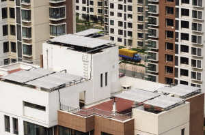 昨日,記者在工作人員的引導下,沿天梯爬上了張家窩家賢里小區的樓頂,看到一塊塊太陽能電池板整齊地排列在樓頂,略微傾斜的太陽能電池板與水平線保持26度左右夾角,一眼望去,很是壯觀。
