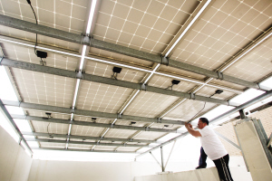 光伏電池組件方陣將太陽能轉化為直流電能,逆變器將直流電能轉變成交流電,最后,通過配套的輸配電設備將電能輸出到公共電網,這是這個太陽能光伏并網發電系統的操作流程。邵志林說:“8600多塊太陽能電池板組成的光伏電池組件方陣,連續不斷地吸收著光能,一年發電量約為159萬度,產生的電量并入國家電網。”