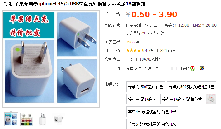 綠點充電器最常見出現在美版的iPhone包裝里,在充電器上有一個綠色的小點,所以被稱之為“綠點充電器”,優點是體積小巧,所以很多朋友都喜歡。除了美版之外,還有歐規綠點充電器以及超薄的美規/歐版充電器。綠點充電器的流行也導致了大量深圳的山寨貨出現,如果你去華強北走一遍,會發現批發店鋪綠點充電器多如牛毛,而在阿里巴巴等平臺也可以看到批發銷售,2、3元一個,如此價格,能有什么質量保障?