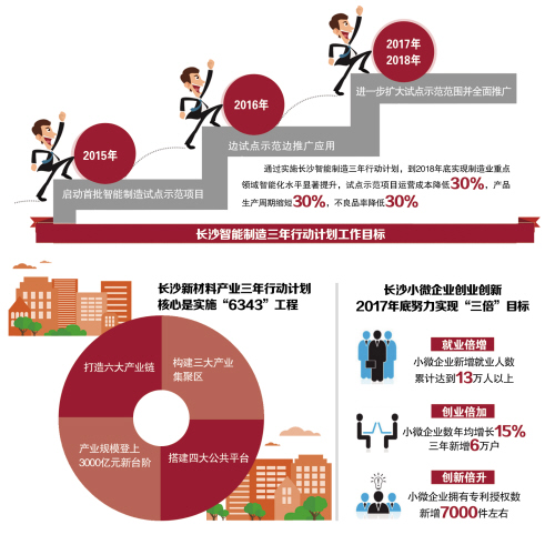 智能制造的發展,在一定程度上決定著長沙工業未來發展的方向和路徑。長沙智能制造三年行動計劃工作目標是:2015年啟動首批智能制造試點示范項目,2016年邊試點示范邊推廣應用,2017年、2018年進一步擴大試點示范范圍并全面推廣。通過實施長沙智能制造三年行動計劃,到2018年底實現制造業重點領域智能化水平顯著提升,試點示范項目運營成本降低30%,產品生產周期縮短30%,不良品率降低30%。