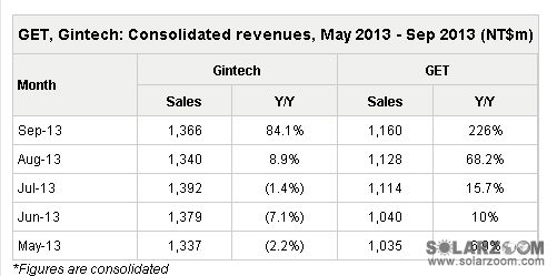 近日,臺(tái)灣太陽能硅片制造商綠色能源科技(GET)公布2013年9月財(cái)報(bào)。據(jù)財(cái)報(bào)顯示,9月,GET合并營收為11.6億新臺(tái)幣(3930萬美元),環(huán)比與同比分別增長2.81%與225.99%,自2011年10月以來的最高水平。