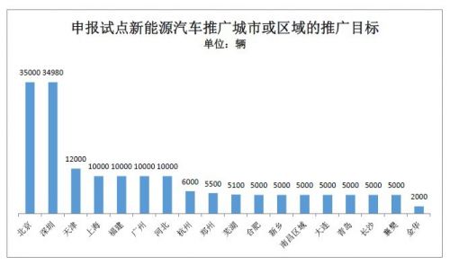 記者通過對深圳等18個申報城市或區域的調研,了解到大部分城市按照5000輛的目標上報。其中,北京目標定得最高,為3.5萬輛;深圳緊隨其后,為3.498萬輛;天津為1.2萬輛;上海和廣州各1萬輛;福建和河北的城市群1萬輛??偵陥笸茝V目標17.558萬輛。