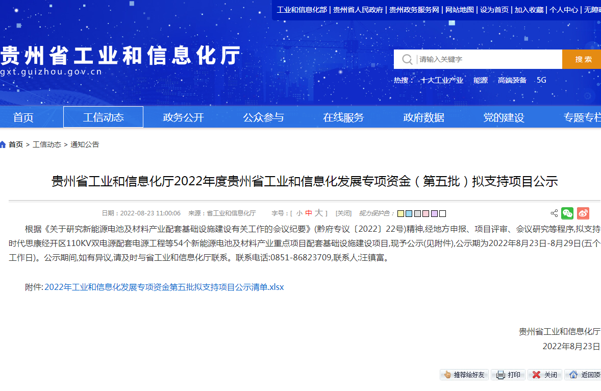 貴州省工業和信息化廳發布消息,根據《關于研究新能源電池及材料產業配套基礎設施建設有關工 ... 查閱全文