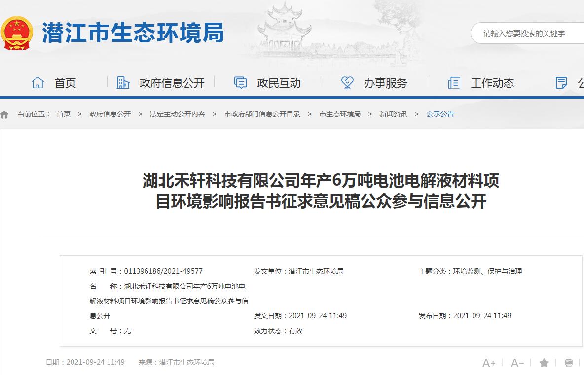 禾軒科技擬選址湖北省潛江市經濟開發區澤口社區居委會一組新建年產6萬噸電池電解液材料項目, ... 查閱全文