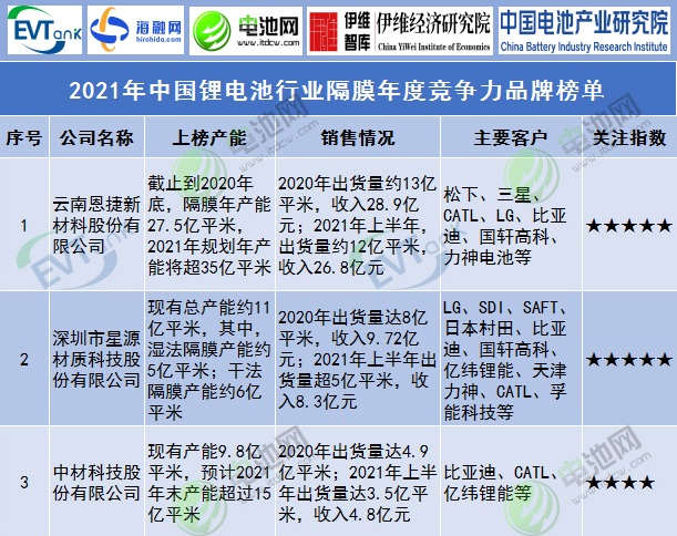 2021年中國鋰電池行業隔膜年度競爭力品牌榜單