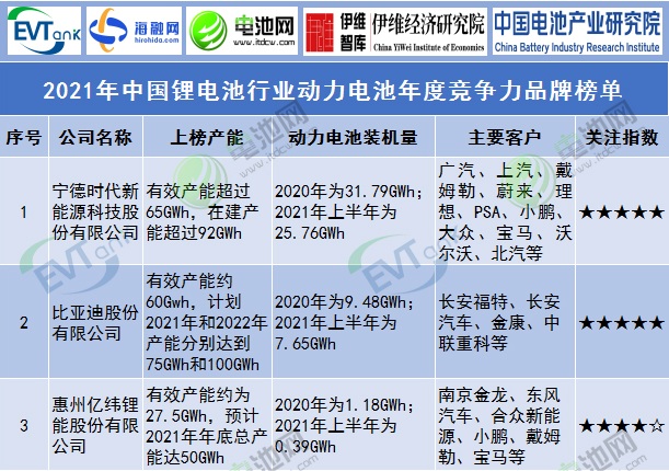 2021年中國鋰電池行業動力電池年度競爭力品牌榜單