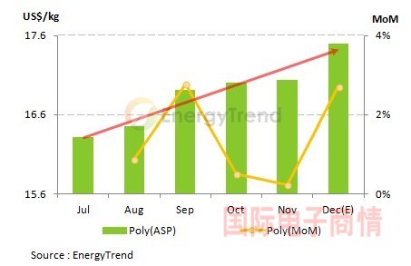 EnergyTrend研究經理胥嘉政指出,多晶硅價格第二季微幅下滑后,2013年下半年隨即一路向上,根據EnergyTrend的資料顯示,自七月多晶硅價格來到近期的相對低點US$16.32/kg后,自此價格從未跌破US$16.4/kg的價位,而第四季多晶硅價格更是站上US$17.0 /kg的關卡,年底現貨市場的平均交易價格已經逼近US$18.0/kg。從月平均價格來看,2013年下半年多晶硅現貨價格漲幅達7.2%,十二月的月均價已來到US$17.5/kg的水準,2014年一月平均價位上看US$19.0/kg到US$20.0/kg之間。
