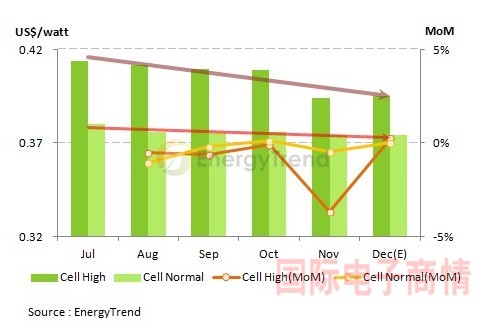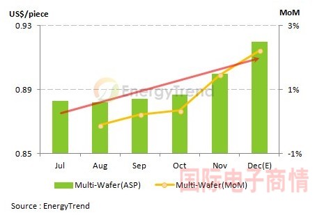 另一方面,由于第四季多晶硅交易價格已站上US$17.0/kg,加上多晶硅片的需求持續攀升,主要業者的產能維持滿載,替價格調漲創造有利的條 件。除此之外,高效多晶硅片的市場已經出現供不應求的狀況,EnergyTrend調查,十二月臺系相關業者已全數向外尋找委外代工的產能,以應付持續涌入的需求。經歷一段準備期后,硅片業也于第四季開始調整價格,2014年一月的平均價格上看US$0.98/piece到US$1.02/piece 之間。
