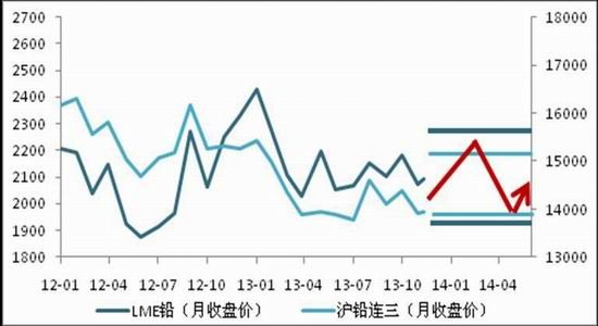 我們認為2014 年世界經濟將普遍處于溫和復蘇的過程中,這將為精煉鉛需求營造較好的外部環境,全球鉛精礦供應偏緊將遏制鉛價的下行區間。國內蓄電池替換型需求的穩步增長、4G 信號基站的建設等將在中長期助推鉛價緩慢上行,但國內同樣面臨產業結構調整、征收蓄電池消費稅以及龐大的庫存壓制等利空因素。因此,我們認為2014 年鉛價難有明顯起色,但運行重心將會略微上移,預計運行區間為13900-15200 元/噸,我們推薦以區間操作的思路應對,當期價接近區間上下沿可選擇高拋低吸的操作。