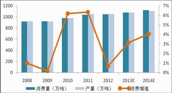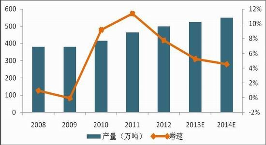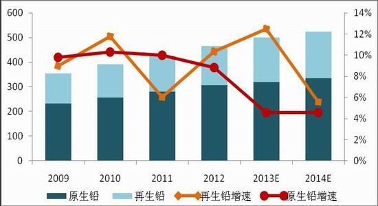 鉛的生產由原生鉛和再生鉛共同組成,預計2014 年我國原生鉛和再生鉛產量仍將保持小幅增加的局面,但整體增速將放緩,預估供給量約為525-530 萬噸左右。
