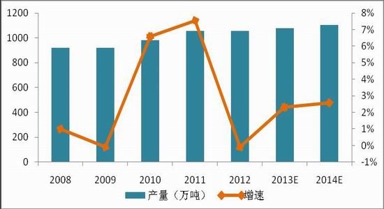 從已公布的資料來看,近年來全球鉛冶煉新增產能投資增速處于下降階段,預計2014 年鉛產量增速會維持較低水平,大約在3.5-4.5%水平,對應產量為1106萬噸左右。