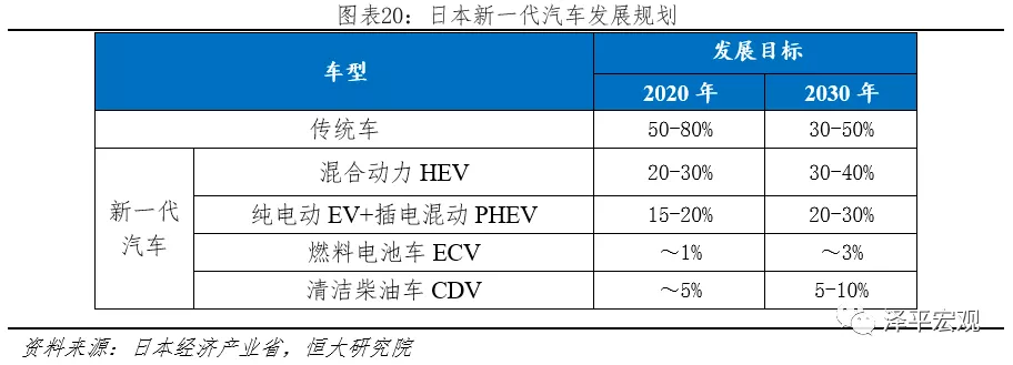 2020年、2030年新能源汽車分別占比15-20%、20-30%。2010年4月日本經(jīng)濟產(chǎn)業(yè)省發(fā)布《下一代汽車戰(zhàn)略2010》,將下一代汽車定義為:非插電式混合動力汽車(HEV)、純電動汽車(BEV)、插電式混合動力汽車(PHEV)、燃料電池汽車(FCV)、清潔柴油汽車(CDV)等。并首次公告發(fā)展目標(biāo):到2020年,下一代汽車將在新車銷量中力爭達(dá)到20%~50%;到2030年,下一代汽車將在新車銷量中力爭達(dá)到50%~70%,并沿用至今。