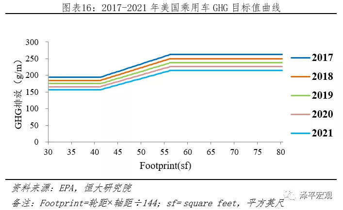 1)CAFE和GHG標(biāo)準(zhǔn):2010年5月,奧巴馬要求美國環(huán)保署(EPA)和美國公路安全管理局(NHTSA)根據(jù)《Clean Air Act》和《Energy Independence and Security Act of 2007》推行國家級2017-2025年輕型車項目,以提升CAFE和降低GHG排放。其中,EPA負(fù)責(zé)制定2017-2025年GHG標(biāo)準(zhǔn),NHTSA負(fù)責(zé)制定2017-2025年CAFE標(biāo)準(zhǔn)。GHG政策第一階段“2017-2021”標(biāo)準(zhǔn)已頒布,第二階段“2022-2025”標(biāo)準(zhǔn),因2018年4月2號,特朗普政府指責(zé)過于嚴(yán)苛,影響就業(yè),需重新修改,新版本暫未公布。CAFE政策第一階段“2017-2021”標(biāo)準(zhǔn)已頒布,第二階段“2022-2025”標(biāo)準(zhǔn)中期評估中,暫未公布。CAFE與GHG相似處頗多:1)皆采用積分制,GHG排放低于目標(biāo)值可獲得正積分,反之負(fù)積分;2)其標(biāo)準(zhǔn)值皆是分車型、參考汽車占地面積“Footprint”為參考。以GHG標(biāo)準(zhǔn)為例,其2017-2021年乘用車目標(biāo)值曲線如下,對于不滿足GHG標(biāo)準(zhǔn)的車企,根據(jù)《Clean Air Act》第205條款,最高可單車罰款37500美元。