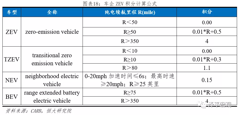 (2)ZEV積分公式:CARB根據(jù)下表所示積分公式計算各企業(yè)ZEV積分,并進(jìn)行年度公示。根據(jù)《Health and Safety Codesection 43211 civil penalty》條例,對于不滿足ZEV積分要求的公司,每個ZEV積分罰款5000美元。