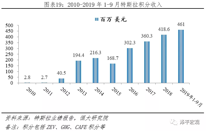 據(jù)特斯拉披露,2010-2019Q3特斯拉累計積分銷售收入21.68億美元,其中2016、2017、2018年,ZEV和非ZEV積分收入分別為2.15、0.87,2.80、0.81,1.03、3.15億美元。