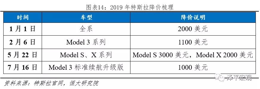 為抵御稅收減免沖擊,2019年1-7月特斯拉四次降價。以特斯拉為例,其2018年底在美國累計電動車銷量超過20萬輛,從2019Q1開始,其單車稅收減免從7500美元減少到3750美元;自2019Q3開始,其單車稅收減免從3750美元減少到1875美元;2020Q1稅收減免取消。為抵御稅收減免下調(diào)帶來的購置成本增加,特斯拉分別在2019年1月、2019年2月、2019年5月、2019年7月四次降價。