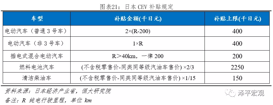 新能源財政補貼由經(jīng)濟產(chǎn)業(yè)省主導(dǎo),分為四類:1)節(jié)能車補貼;2)CEV(CleanEnergy Vehicle)導(dǎo)入補貼;3)充電設(shè)施補貼;4)加氫設(shè)備補貼。其中節(jié)能車補貼于2012年9月廢除,被CEV補貼取代;加氫設(shè)備補貼主要針對氫燃料電池,充電設(shè)施補貼主要針對充電樁,當(dāng)前新能源汽車主要推動力在“CEV導(dǎo)入補貼”。