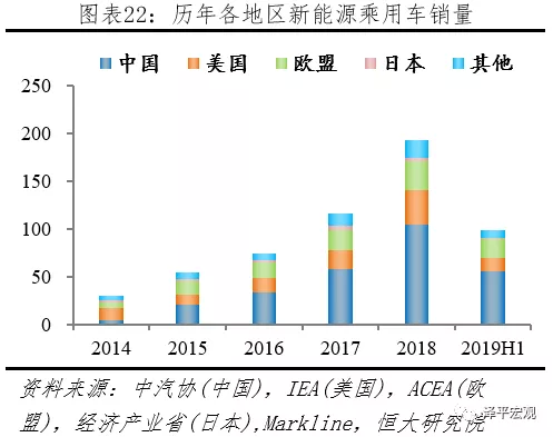 2019H1新能源乘用車全球份額,中國五成、歐盟兩成、美日共兩成。據中汽協披露,2018、2019H1中國新能源乘用車分別銷售105.3、56.3萬輛;據IEA、Markline披露,2018、2019H1美國新能源乘用車分別銷售36.1、13.7萬輛;據ACEA披露,2018、2019H1歐盟新能源乘用車分別銷售30.2、19.8萬輛;據經濟產業省、Markline披露,2018、2019H1日本新能源乘用車分別銷售18.4、7.4萬輛;據IEA、Markline披露,2018、2019H1其它地區新能源乘用車分別銷售18.4、7.4萬輛。按照上述統計, 2019H1中國、美國、歐盟、日本、其它地區新能源乘用車市場份額分別為56.9%、13.8%、20.0%、1.8%、7.5%。