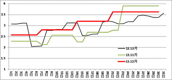 13年12月的車市零售增長出現前低后高的局面,下旬的市場增長較為迅猛,尤其是12年的12月月末相對走弱,13年的12月中旬較強,下旬也是大幅走強。由于地方限購政策的傳言愈演愈烈,而霧霾天氣的安全角度也是開車出行更好,因此12月的下旬市場走強較明顯。