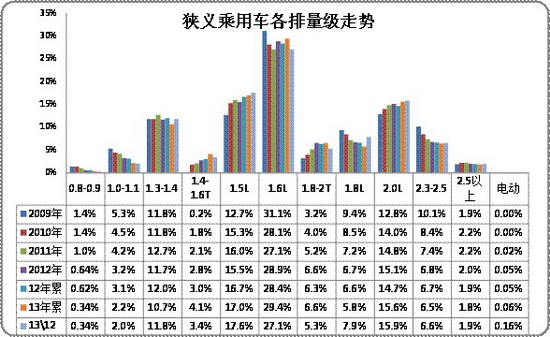 13年的狹義乘用車排量趨于中大型化,低端小排量市場表現相對較弱。尤其是SUV市場的份額增大帶動總體排量的提升較明顯。SUV自身是趨于排量小型化趨勢,而轎車排量相對是大型化的趨勢,MPV的低端微客類車型占比不斷上升也促進排量小型化。排量大型化和消費向SUV升級是近期的趨勢,但秋冬季的入門及消費帶動排量下移也是趨勢,12月排量為1.75升,較7月的1.79升下降較大。