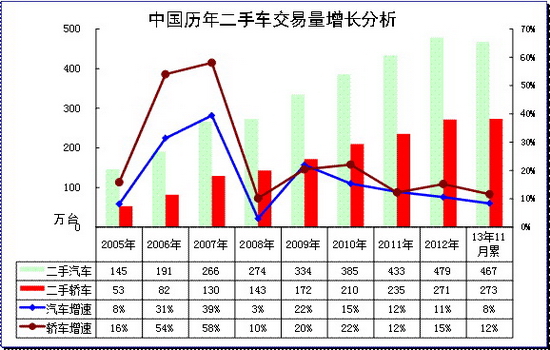 根據中國汽車流通協會數據,2013年1-11月交易量交易量 466.96萬輛,相比去年同期增長 8.39% .交易額 2592.61億元,相比去年同期增長 9.30%。其中基本型乘用車 272.84萬輛,同比增長 11.61%,交易額 1549.40億元。客車 69.20萬輛,同比降低 2.05%,交易額 287.78億元。載貨車 60.59萬輛,同比增長 1.14%,交易額 249.39億元。越野車 14.91萬輛,同比增長 52.48% ,交易額 240.40億元。。