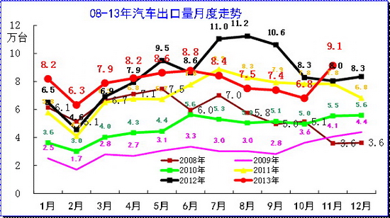 12年1-12月全國海關出口101.6萬臺,增速20%,13年1-11月的出口增速回落到-6%的較低水平。總體看今年的進出口走勢逐步弱化,出口趨弱而進口回暖,尤其是隨著人民幣升值突破6.1 和日元貶值,今年的出口高增長難度大,日系進口車回升的可能性大。
