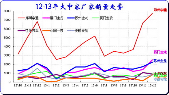 13年初春節(jié)因素的影響下的大客市場(chǎng)銷售出現(xiàn)季節(jié)性下滑,但由于柴油國(guó)四該實(shí)施的機(jī)會(huì)促進(jìn),6月的大客的市場(chǎng)暫時(shí)暴增,但新能源車補(bǔ)貼尚未出臺(tái),加之校車等需求相對(duì)弱化,8-11月的大客市場(chǎng)相對(duì)低迷,12月的年末的銷售高潮出現(xiàn),全國(guó)性霧霾導(dǎo)致改用清潔燃料的大客的需求仍是較大的。