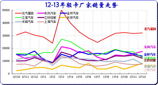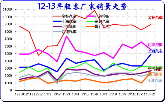 13年春節(jié)后的輕客走勢(shì)較強(qiáng),主力企業(yè)小幅增長(zhǎng),二線企業(yè)大幅走強(qiáng)。8-12月的金杯平穩(wěn),江鈴走勢(shì)持續(xù)走強(qiáng)。而福田和廈門金龍的輕客走強(qiáng),電商物流帶動(dòng)中低端輕客表現(xiàn)較好。
