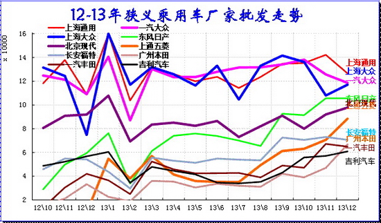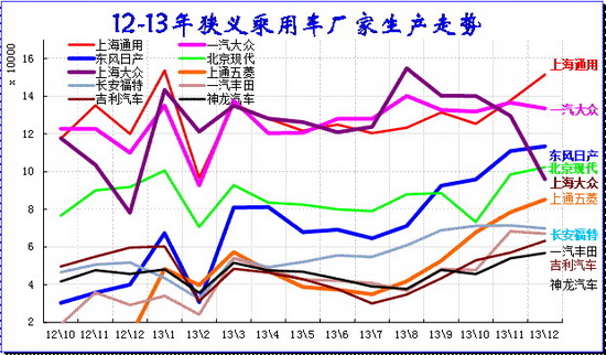 13年12月的廠家產(chǎn)銷競(jìng)爭(zhēng)仍是較激烈的,走勢(shì)差異性大。日系主力企業(yè)相對(duì)12年同期逐步恢復(fù)元?dú)猓瑬|風(fēng)日產(chǎn)持續(xù)超越北京現(xiàn)代的生產(chǎn)量。南北大眾的12月產(chǎn)量相對(duì)11月平穩(wěn),但一汽大眾的產(chǎn)量?jī)H同比增9%,上海大眾增22%。 日系的東風(fēng)日產(chǎn)和豐田、神龍、廣本都是環(huán)比11月的產(chǎn)量稍有增長(zhǎng),說(shuō)明日系的增長(zhǎng)是恢逆周期擴(kuò)張。一汽豐田本月拉升較猛。
