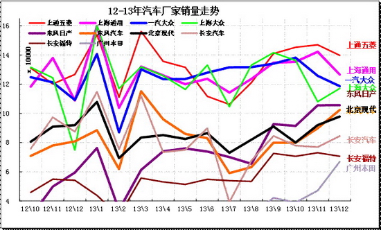 13年狹義乘用車銷量1637.8萬(wàn)臺(tái),累計(jì)增速19.9%;13.12月狹義乘用車銷量167.33萬(wàn)臺(tái),同比增長(zhǎng)30.2%,環(huán)比增長(zhǎng)6.2%。。13年12月的主力長(zhǎng)銷量走勢(shì)仍是集群化特色較明顯,南北大眾和上海通用仍是核心的一陣營(yíng),日產(chǎn)和現(xiàn)代是二陣營(yíng),長(zhǎng)安福特同比增37%屬?gòu)?qiáng)勢(shì)跟進(jìn),其他幾家合資企業(yè)也是環(huán)比微增。