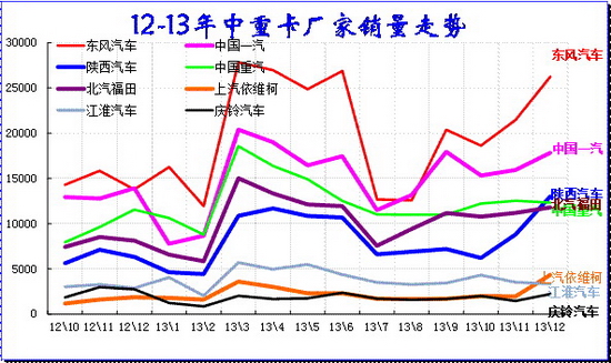 由于今年春節(jié)晚,3月的中重卡才開始節(jié)后沖量,2季度的中重卡走勢(shì)超強(qiáng)。7-8月的中重卡大幅回落,但隨著投資增長(zhǎng)和環(huán)保標(biāo)準(zhǔn)提升,9-12月的中重卡又有一定的回升。12月的東風(fēng)和陜汽的增長(zhǎng)較強(qiáng),重汽也是表現(xiàn)不錯(cuò)。但年末高增長(zhǎng)不正常,這透支14年需求。