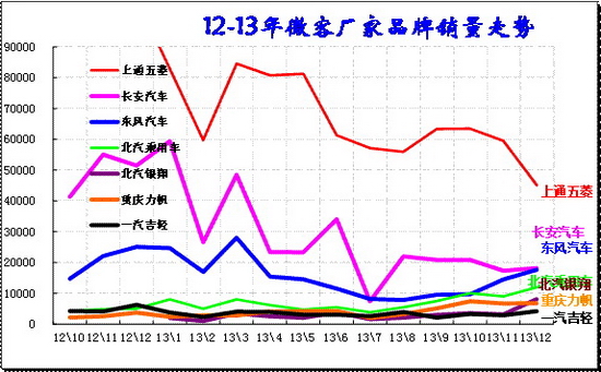 13年微客銷量155.35萬(wàn)臺(tái),累計(jì)增速-2.3%;13.12月銷量11.15萬(wàn)臺(tái),同比增長(zhǎng)-32.9%,環(huán)比增長(zhǎng)-4.2%。微客市場(chǎng)主力廠家全力轉(zhuǎn)型到MPV市場(chǎng),部分微客高端需求也轉(zhuǎn)移到MPV,因此主力廠家表現(xiàn)相對(duì)較差。