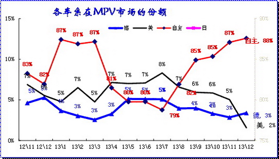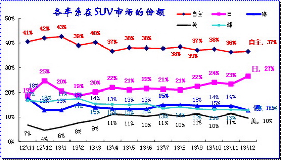 SUV市場從日系主導的市場轉為近期的自主為主導的市場,近兩年日系在SUV份額嚴重下滑,德系也因缺乏新品而表現偏弱。市場格局重新調整。相對12年同期,13年12月的日系已經開始恢復,德系下滑4%,韓系下滑6%。