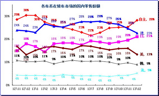 13年12月的車市零售相對去年同期較強,且自主走強較明顯。13年春節前的走強的主要是自主品牌,節后的自主品牌份額持續回落,3-7月的自主回落,德系份額相對穩定走強,日系份額平穩,美系份額保持高位。而13年的中日政治關系激化對日系影響明顯弱化,13年10-12月日系持續回升,自主也沖刺走強,其他合資車系主動收縮。
