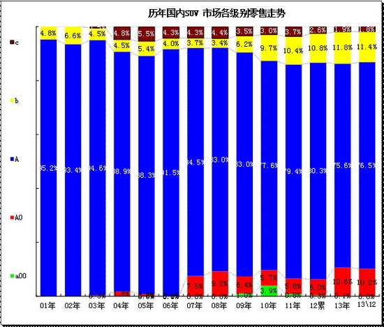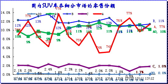 SUV市場的熱點發散后集中,現在又面臨熱點擴大的趨勢。SUV 市場多年來依舊維持A級超強的走勢,這其中的A 級包含所有的傳統皮卡型SUV的產品,這樣不影響總體分析效果。前幾年A級SUV份額出現持續的下降,這是市場發散的結果。而11年-12年的A級SUV份額增長,13年12月的份額回落到77%,這主要是小型SUV新品的促進。13年的A0及份額增長到10.6%,12月達到10.2%,這也是SUV市場發散化的趨勢。