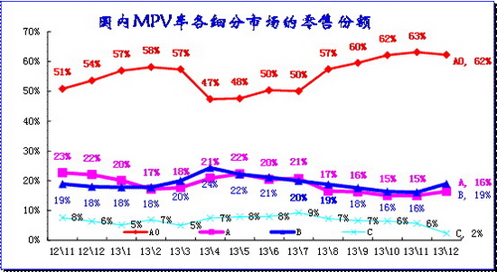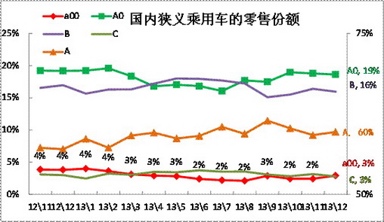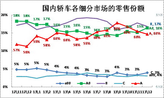 同樣的A0級車和B級車的份額也是在17%左右徘徊的,12年11月至13年3月的B級車份額受日系銷量下滑而回落,4月的B級車超越AO級而恢復地位,8月的A0級車已經反超B級車,9-12月的A0級車因微客類MPV而份額偏高。而A級車作為車市的核心支柱,其份額近期在59%左右緩步上升,13年12月達到60%,形成穩定的主力市場。