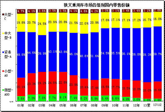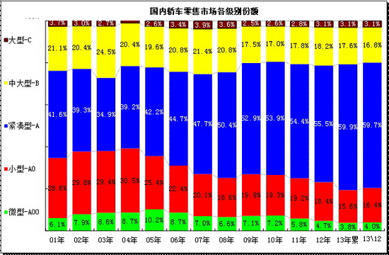 此圖應分兩部分看,01-08年的走勢和09-12年的變化兩部分。從01年到08年的總體走勢是高級別下壓,A級車型表現較強,09-12年是重演05-08年的趨勢。但13年的經濟型車低迷急速嚴峻。