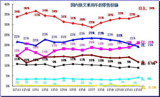 轎車市場的日系復蘇,其他合資品牌調整是目前的狀態趨勢。自主品牌銷量波動劇烈,12年12月達到30%的近期高點,隨后大幅回落到13年7月22%,12月回升到28%。