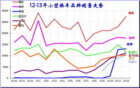 由于大城市限購,小城鎮喜歡大空間的,年輕人喜歡時尚品牌的,今年的微轎極其艱難,尤其是年末的微轎市場的反差巨大。13年底的微轎車型基本都比1月銷量高,而12年的很多車型12月銷量比11月低,這說明今年微轎車型沒有藏量的資源,也是市場較弱的表現。11-12月的QQ是在努力拉升銷量,而奔奔迷你也是出現小幅回升,沒有12年同期的大幅回調的現象。