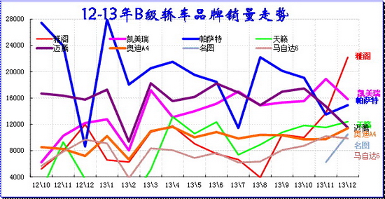 日系的新品B級車開始增量,雅閣、天籟等仍有超強的恢復能力,畢竟其世界地位是不可撼動的,暫時政治波動炒作也會被厭倦。13年12月的轎車份額78%,SUV的份額拉升到14%,MPV的份額回落到8%,但相對12年12月的轎車份額仍是大降,SUV等暴增趨勢明顯,而高端車市場的私車消費向SUV升級成為主要增長推動力。